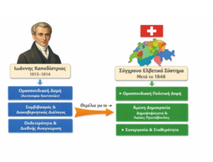 Αβίαστα στο μυαλό μας ξεκινά μία σύγκριση των δύο πολιτικών συστημάτων. Όχι, δεν σκεφτόμαστε αλλαγή πολιτεύματος, αλλά θα μπορούσαμε – εμπνεόμενοι από αυτή την χώρα, που στον «παππού» μας μπάρμπα Γιάννη (Ιωάννη Καποδίστρια) οφείλει πολλά, να πάρουμε πράγματα.