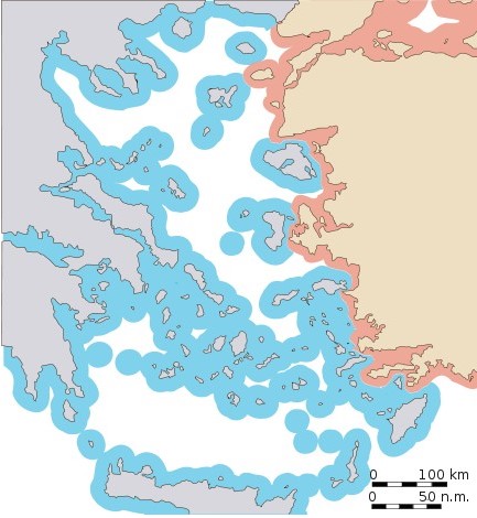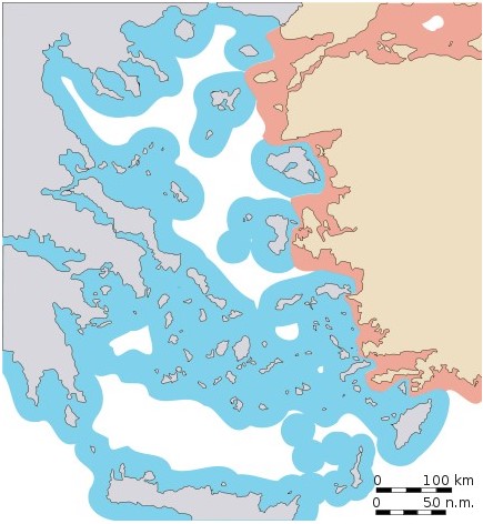 [26] Σε περίπτωση που η Ελλάδα επεκτείνει τα χωρικά της ύδατα στα 10 ή 12 ν. μίλια, η αμφισβήτηση ως προς την υφαλοκρηπίδα θα περιοριστεί ουσιαστικά στις περιοχές του βυθού γύρω από τα νησιά Λέσβο και Χίο, καθώς βόρεια και νότια αυτών τα ελληνικά νησιά είναι τόσο κοντά το ένα στο άλλο που δεν θα υπάρχουν διεθνή ύδατα κοντά σε τουρκική αιγιαλίτιδα.