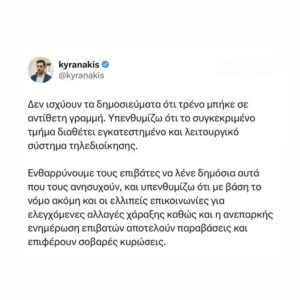 Μετά την αποκάλυψη της σελίδας μας, ο υφυπουργός Μεταφορών, Κωνσταντίνος Κυρανάκης, προχώρησε σε ανάρτηση στα κοινωνικά δίκτυα, επιχειρώντας να διαψεύσει το δημοσίευμά μας: