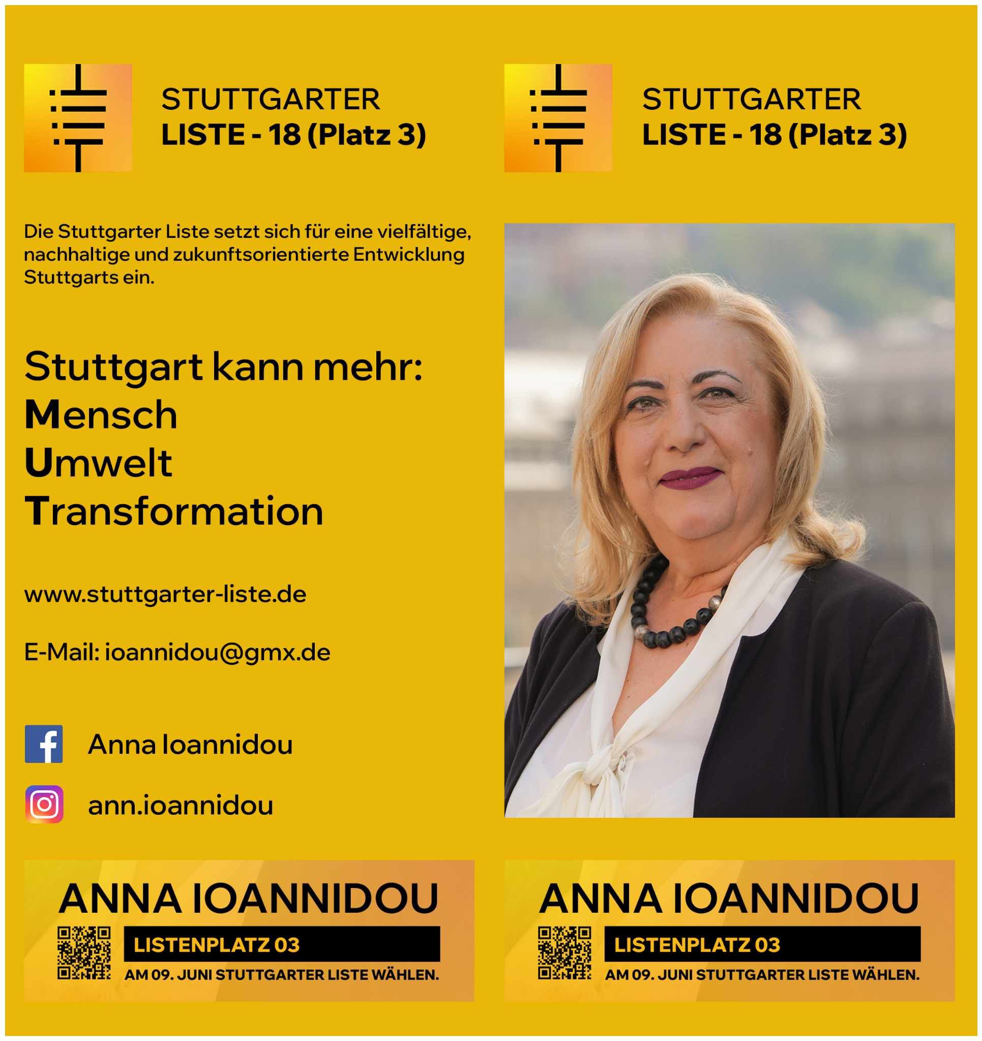 Επίσης σας ενημερώνω ότι φέτος κατεβαίνω ως υποψήφια δημοτική σύμβουλος στο δήμο Στουτγάρδης με την λίστα Stuttgarter Liste (λίστα 18) στην θέση 3. Είναι πρώτη φορά μετανάστης ελληνικής καταγωγής να βρίσκεται τόσο μπροστά σε ψηφοδέλτιο στο δήμο Στουτγάρδης. Είναι τιμή για μένα που μου προτάθηκε η θέση αυτή και αν καταφέρουμε να πάμε μαζικά να ψηφίσουμε για να έχουμε φωνή στο δήμο που ζούμε, τότε αυτό και μόνο θα είναι μία ευτυχής επιτυχία. Διότι τις τελευταίες εκλογές μόνο 10% των πολιτών με ελληνική καταγωγή συμμετείχαν στις εκλογές. Στόχος είναι να πολλαπλασιάσουμε το ποσοστό.
