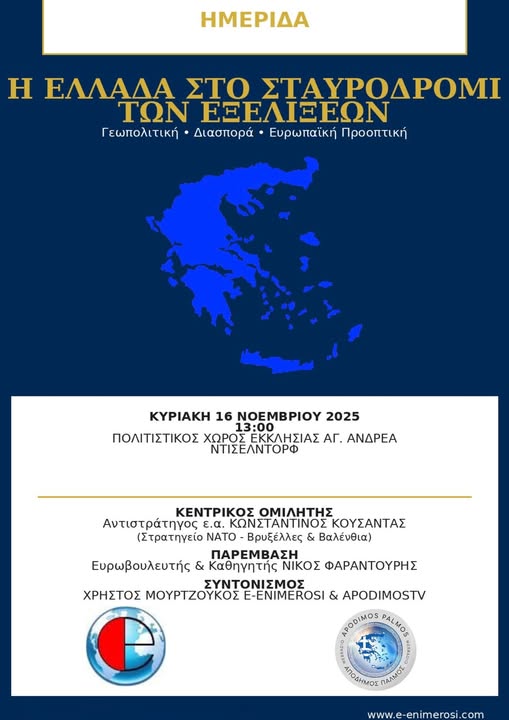 Μια σημαντική ημερίδα με θέμα «Η Ελλάδα στο σταυροδρόμι των εξελίξεων: Γεωπολιτική – Διασπορά – Ευρωπαϊκή Προοπτική» θα πραγματοποιηθεί την Κυριακή 16 Νοεμβρίου 2025, στις 13:00, στον Πολιτιστικό Χώρο της Εκκλησίας Αγίου Ανδρέα στο Ντίσελντορφ.