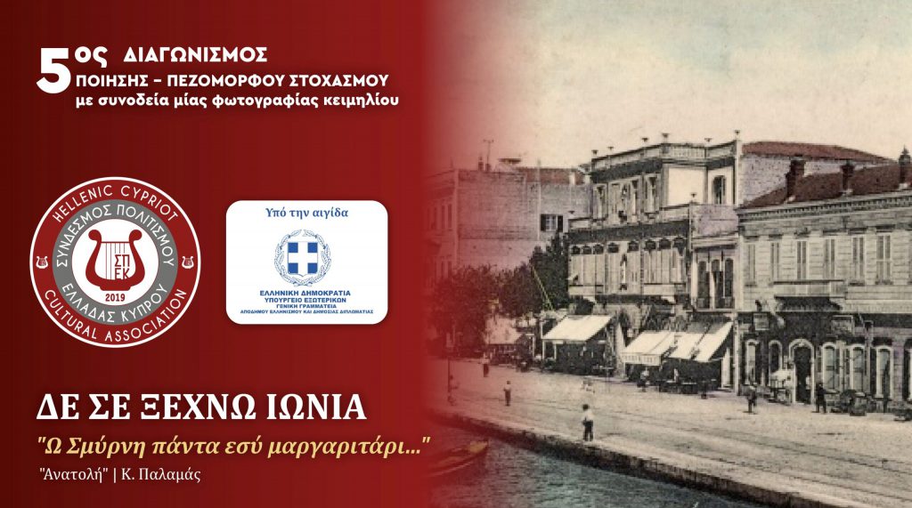 Πραγματοποιείται ο 5ος Διαγωνισμός Ποίησης και Πεζόμορφου Στοχασμού συνοδεία φωτογραφίας-κειμηλίου, με θέμα ΔΕ ΣΕ ΞΕΧΝΩ ΙΩΝΙΑ «Ω Σμύρνη πάντα εσύ μαργαριτάρι…» (Ανατολή | Κ. Παλαμάς). Ο Διαγωνισμός ξεκίνησε στις 15/5/2022 και λήγει στις 30/6/2022. Απευθύνεται σε άτομα κάθε ηλικίας και θεματικά αφορά τόσο το υψηλό επίπεδο της ζωής στην Ιωνία μέχρι το 1921, όσο και τη Μικρασιατική Καταστροφή (1922). Οι συμμετέχοντες, μαζί με το ποίημα ή τον πεζόμορφο στοχασμό τους, θα πρέπει να αποστείλουν και μία φωτογραφία με λεζάντα, Ιώνων συγγενών ή φιλικής οικογένειας από την Ιωνία.