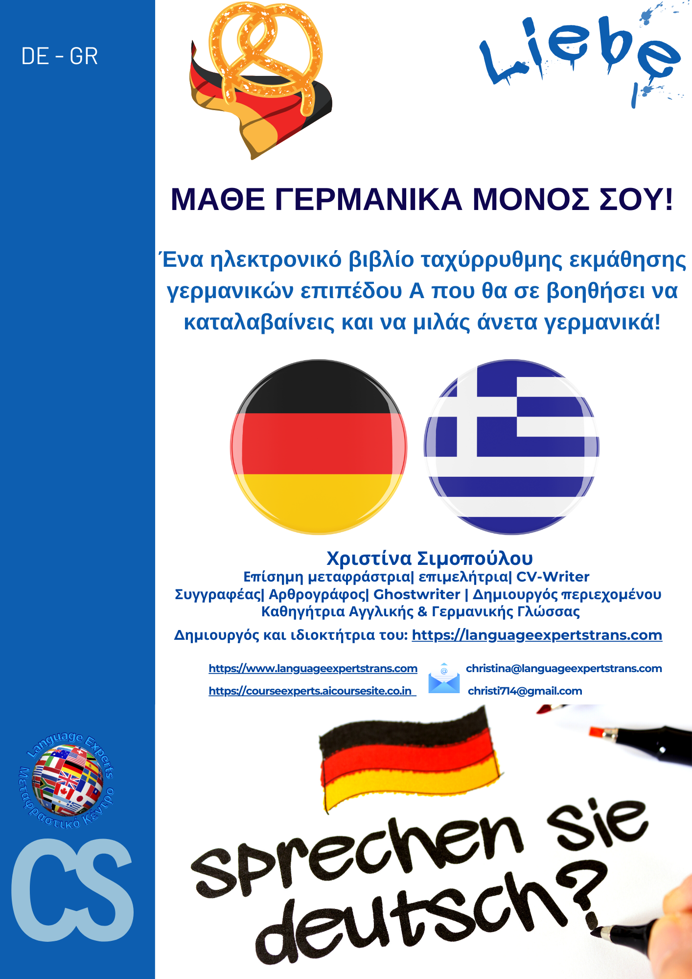 Δημιούργησα τον οδηγό αυτό για να σε βοηθήσω να αποκτήσεις εύκολα, οικονομικά κι από την άνεση του σπιτιού σου τις γνώσεις των γερμανικών που χρειάζεσαι για να κάνεις τα πρώτα σου βήματα σε μία γερμανόφωνη χώρα!