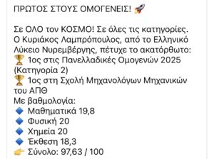 Ο Σύλλογος εύχεται στον ίδιο, στους συμμαθητές του, του ΓΕΛ Νυρεμβέργης, καθώς και στα μέλη της νεολαίας του ΣΠΝ που συμμετείχαν στις εξετάσεις, ευγενή ακαδημαϊκή πρόοδο και έντιμη επαγγελματική σταδιοδρομία.