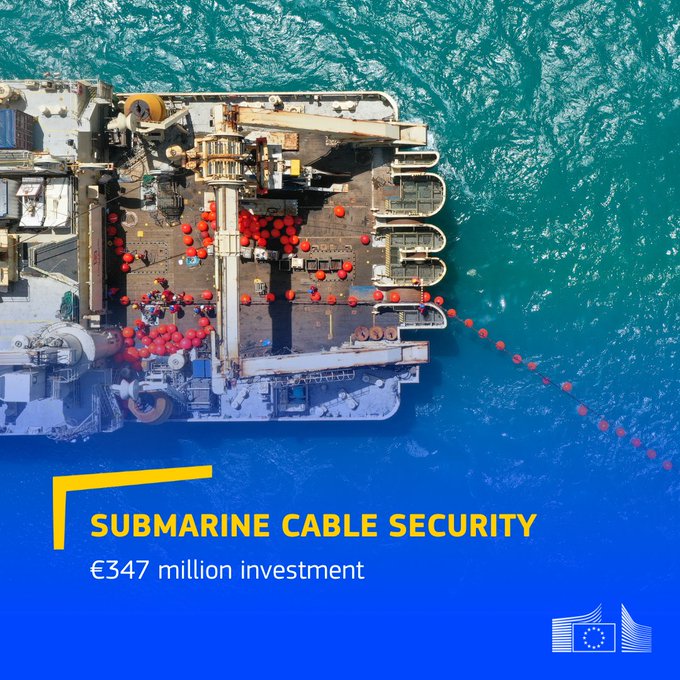 Με ένα ευρύ πακέτο μέτρων και επενδύσεων ύψους 347 εκατ. ευρώ, η Ευρωπαϊκή Επιτροπή ενισχύει την ασφάλεια και την ανθεκτικότητα των υποβρύχιων καλωδίων, κρίσιμων υποδομών που μεταφέρουν περίπου το 99% της διηπειρωτικής διαδικτυακής κίνησης και στηρίζουν την ευρωπαϊκή οικονομία και την καθημερινή ζωή.