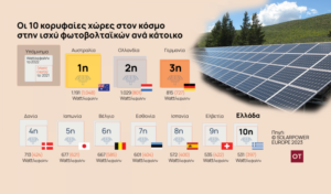 Τη δέκατη θέση καταλαμβάνει η Ελλάδα στη λίστα με τις 10 κορυφαίες χώρες στον κόσμο όσον αφορά στην ισχύ φωτοβολταϊκών ανά κάτοικο. Με βάση τα στοιχεία του 2022, πρώτη είναι η Αυστραλία με 1.191 watt ανά κάτοικο, δεύτερη η Ολλανδία με 1.029 watt ανά κάτοικο , τρίτη η Γερμανία με 815 watt ανά κάτοικο, και ακολουθούν η Δανία (713 watt ανά κάτοικο), η Ιαπωνία (677 watt ανά κάτοικο), το Βέλγιο (667 watt ανά κάτοικο), η Εσθονία (601 watt ανά κάτοικο), η Ισπανία (572 watt ανά κάτοικο), η Ελβετία (535 watt ανά κάτοικο) και η Ελλάδα (531 watt ανά κάτοικο).