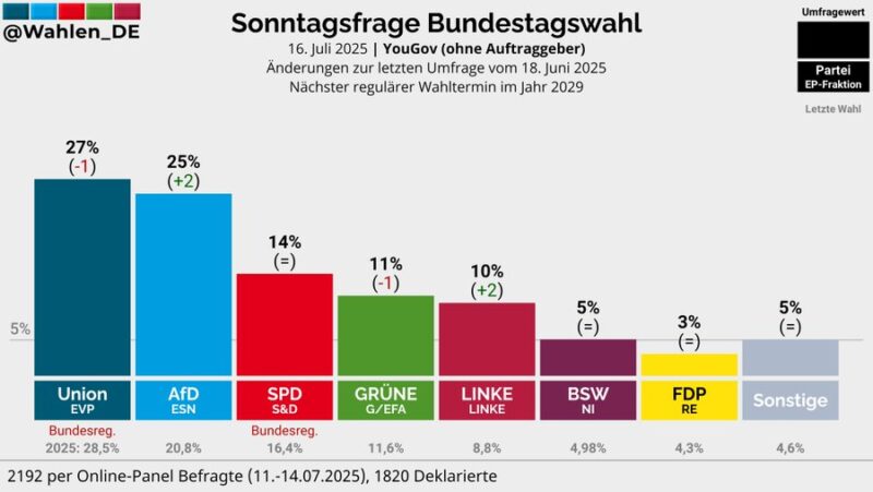 Η έρευνα διεξήχθη διαδικτυακά σε δείγμα 2.192 ατόμων το διάστημα 11 έως 14 Ιουλίου 2025 και αποτυπώνει την ενίσχυση του AfD και τη στασιμότητα των παραδοσιακών δυνάμεων του κυβερνητικού συνασπισμού.