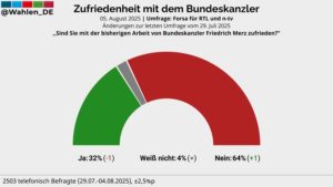 Μόλις το 32% των πολιτών δηλώνει ικανοποιημένο με την έως τώρα θητεία του Μερτς, ενώ η συντριπτική πλειοψηφία (64%) εκφράζει δυσαρέσκεια. Το υπόλοιπο 4% δεν διατυπώνει ξεκάθαρη γνώμη. Η συγκεκριμένη εικόνα δείχνει έναν καγκελάριο που έχει χάσει την επαφή με μεγάλο μέρος της κοινωνίας, σε μια περίοδο έντονων κοινωνικών και οικονομικών προκλήσεων.