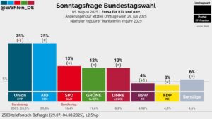 Τα ευρήματα της λεγόμενης «Ερώτησης της Κυριακής» από τη Forsa εντείνουν ακόμη περισσότερο το κλίμα πολιτικής ρευστότητας. Η Χριστιανική Ένωση (CDU/CSU) και η AfD βρίσκονται πλέον σε απόλυτη ισοδυναμία, συγκεντρώνοντας από 25%, με την Ένωση να σημειώνει πτώση μιας ποσοστιαίας μονάδας σε σχέση με τα τέλη Ιουλίου.