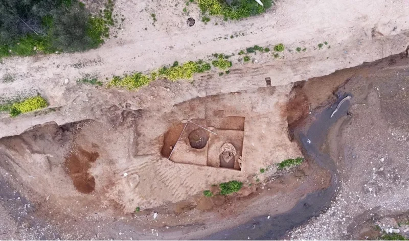 Σύμφωνα με ανακοίνωση του Υπουργείου Πολιτισμού, ο πίθος είχε τοποθετηθεί μέσα σε λάκκο λαξευμένο στο αργιλώδες έδαφος της νότιας όχθης του ρέματος. Πρόκειται για επιβλητικό αγγείο ύψους 1,74 μέτρων, με οριζόντιες λαβές στην κοιλιά και χαρακτηριστική σχοινοειδή ανάγλυφη διακόσμηση στον λαιμό και τις λαβές. Το στόμιο ήταν προσεκτικά σφραγισμένο με ημικυκλικό τοίχο από ποταμίσιες κροκάλες, ενώ δύο μεγάλοι λίθοι, πλαισιωμένοι από μικρότερες πλακοειδείς πέτρες, σχημάτιζαν μια ιδιότυπη «ψευδόθυρα» με παραστάδες και κατώφλι.