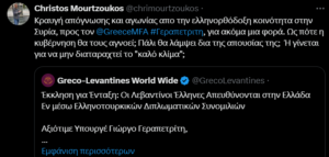Οι Λεβαντίνοι Έλληνες απευθύνονται στην Ελλάδα εν μέσω ελληνοτουρκικών διπλωματικών συνομιλιών. Κραυγή απόγνωσης και αγωνίας από την ελληνορθόδοξη κοινότητα στην Συρία, προς τον Έλληνα υπουργό εξωτερικών Γιώργο Γεραπετρίτη.