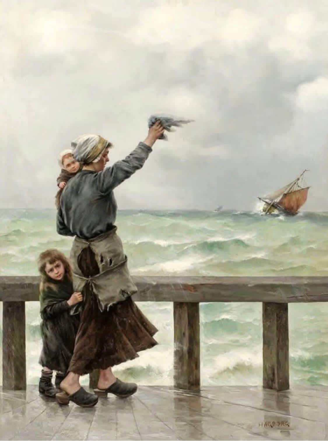 Ανυπομονεί να ακούσει τη φωνή του πατέρα του στο τηλέφωνο. Μέρες και μήνας θα περάσουν να ολοκληρωθεί η επιθυμία αυτή. Η μητέρα κινεί το μαντήλι της όσο πιο ψηλά μπορεί, μέχρι που η εικόνα του πλοίου χάνεται στα κύματα της φουρτουνιασμένης θάλασσας… Φουρτουνιασμένη όπως νιώθει… ταραγμένη από το μακρινό ταξίδι του συζύγου της και μόνη της, αναρωτιέται πώς θα ευδοκιμήσει, πώς θα πλοηγήσει και πώς θα επικρατήσει η όλη κατάσταση είτε για μήνες είτε για χρόνια κατά τη διάρκεια της απουσίας του.