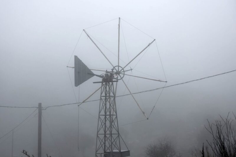 Οι ανεμόμυλοι, σιωπηλοί και ακίνητοι, έμοιαζαν με ξεχασμένους φρουρούς μιας άλλης εποχής, καθώς τα λευκά πανιά τους χάνονταν μέσα στη γαλακτερή θαμπάδα. Το φως του πρωινού δεν είχε ακόμη τη δύναμη να διαπεράσει το πυκνό αυτό στρώμα, κι έτσι όλα παρέμεναν βυθισμένα σε μια αδιόρατη, σχεδόν μεταφυσική ηρεμία.