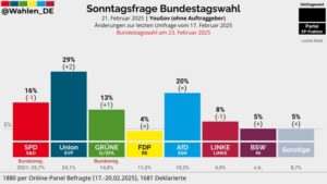 Σύμφωνα με το τελευταίο «Πολιτικό Βαρόμετρο» του ZDF, ο συνασπισμός CDU/CSU καταγράφει πτώση στο 28%, ενώ το AfD βρίσκεται στο 21%. Οι Σοσιαλδημοκράτες (SPD) στο 16%, οι Πράσινοι στο 14% και η Αριστερά (Die Linke) ανεβαίνει στο 8%.