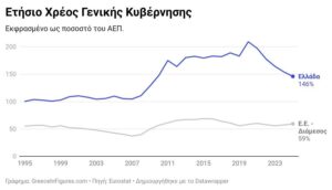Στο 146% του ΑΕΠ το χρέος της Ελλάδας το 2025, το οποίο είναι μειωμένο κατά 8,2 ποσοστιαίες μονάδες σε σχέση με το 2024. Πρόκειται για το χαμηλότερο επίπεδο χρέους ως ποσοστό του ΑΕΠ από το 2009.