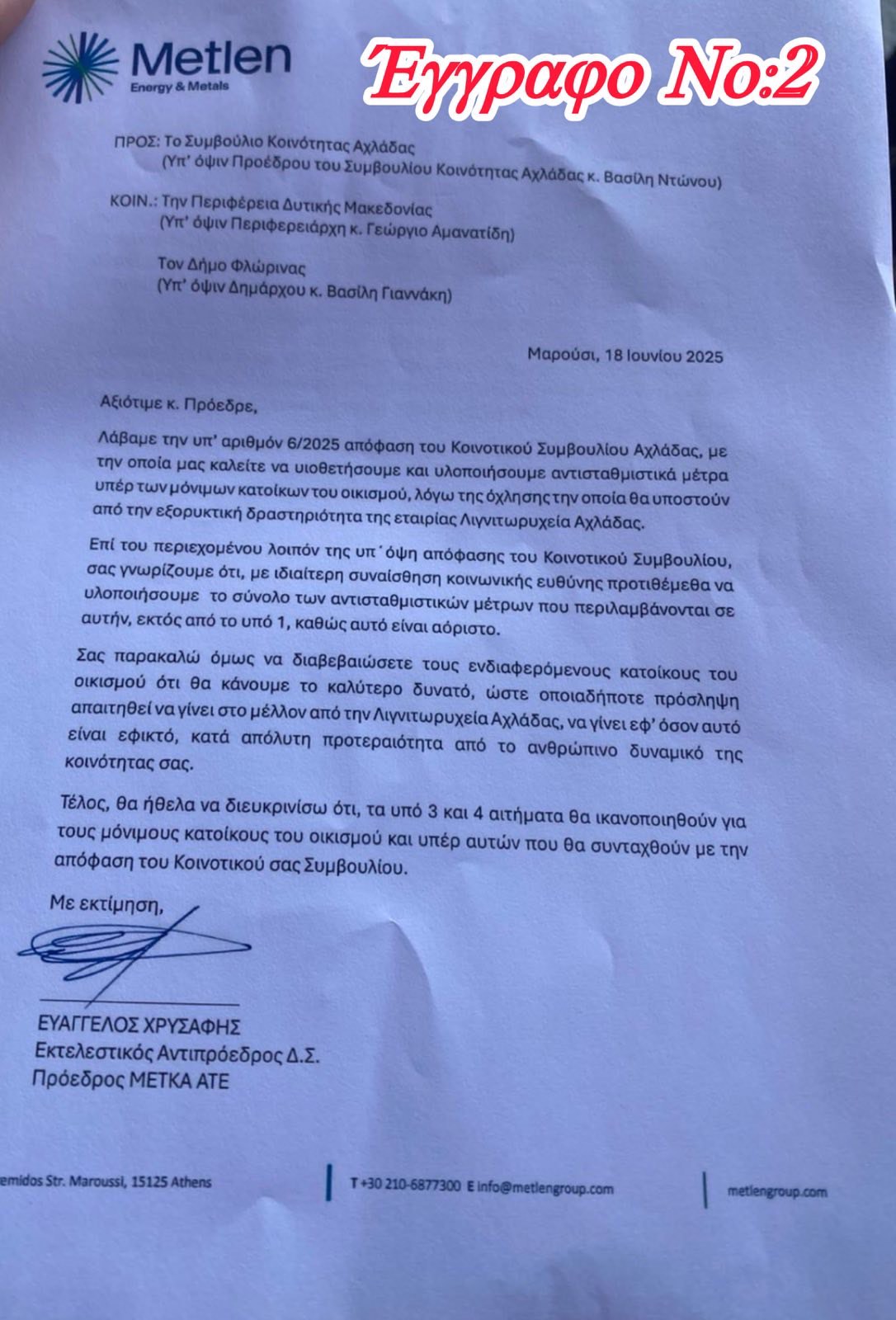 Η πρόταση έγινε αποδεκτή από τη METLEN μόλις τρεις ημέρες αργότερα, στις 18 Ιουνίου 2025 (Έγγραφο Νο 2), και κοινοποιήθηκε τόσο στην Περιφέρεια Δυτικής Μακεδονίας, υπόψη του περιφερειάρχη κ. Αμανατίδη, όσο και στον Δήμο Φλώρινας, υπόψη του δημάρχου κ. Γιαννάκη.