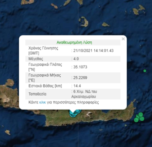Νέος σεισμός σημειώθηκε στις 5:14 το απόγευμα στο Αρκαλοχώρι.
