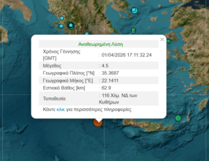 Σεισμική δόνηση μεγέθους 4,5 βαθμών της κλίμακας Ρίχτερ καταγράφηκε το απόγευμα της Τετάρτης σε θαλάσσια περιοχή δυτικά της Κρήτη, προκαλώντας ανησυχία χωρίς ωστόσο να υπάρχουν αναφορές για ζημιές ή τραυματισμούς.