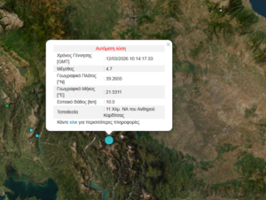 Σεισμική δόνηση μεγέθους 4,8 βαθμών της κλίμακας Ρίχτερ σημειώθηκε στην Καρδίτσα λίγα λεπτά μετά τις 12:00 το μεσημέρι της Πέμπτης 12 Μαρτίου 2026.