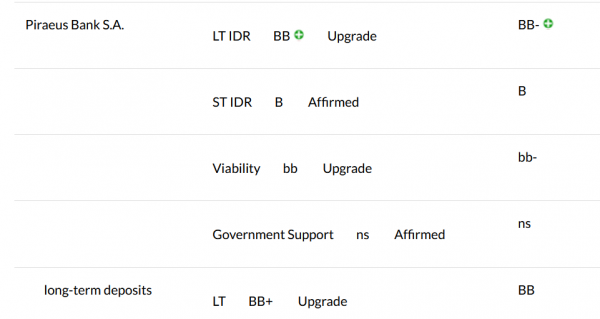 Ειδικότερα, για την Εθνική Τράπεζα και την Eurobank, η Fitch αναβάθμισε τη Μακροπρόθεσμη Αξιολόγηση (IDR) τους σε «BB+» από «BB», ενώ για την Alpha Bank και την Πειραιώς η αναβάθμιση είναι στο BB από ΒΒ- προηγουμένως.