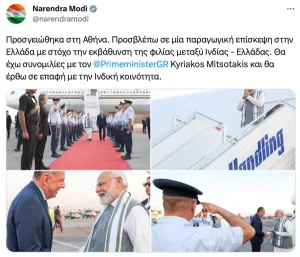 Στην Αθήνα βρίσκεται ο Ινδός πρωθυπουργός Ναρέντρα Μόντι, ο οποίος έγινε δεκτός στο αεροδρόμιο «Ελευθέριος Βενιζέλος» από μέλη της ινδικής κοινότητας, καθώς και από τον υπουργό Εξωτερικών Γιώργο Γεραπετρίτη.