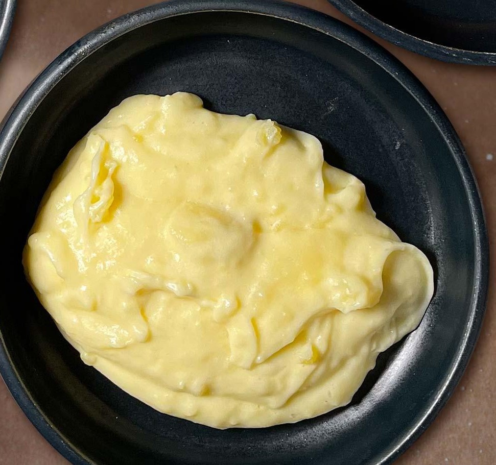Ο φούρνος προθερμαίνεται στους 180°C στον αέρα. Σε μίξερ με σύρμα χτυπιέται το βούτυρο με τη ζάχαρη μέχρι να αφρατέψουν. Στη συνέχεια, τα αυγά προστίθενται σταδιακά, ένα-ένα, μέχρι να ενσωματωθούν πλήρως.
