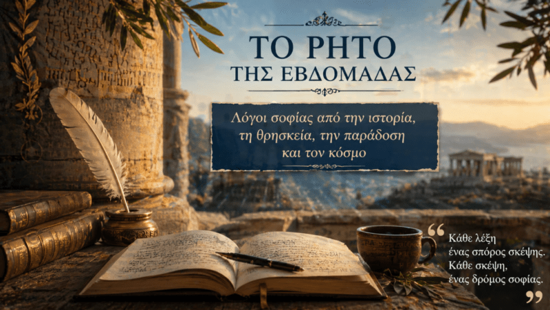 Ορισμένα έγιναν κομμάτι της καθημερινής σας σκέψης, ακόμη και μόνιμο σημάδι στο σώμα σας. Κάθε εβδομάδα επιλέγουμε και σας παρουσιάζουμε ένα νέο ρητό, γνωμικό, παροιμία ή απόφθεγμα, από την ιστορία, τη θρησκεία, την αρχαία και τη σύγχρονη ελληνική παράδοση, μαζί με λόγους σοφίας από ποικίλες εποχές και πολιτισμούς. Το σημερινό ρητό μας αναφέρεται στην αγάπη για την πατρίδα.