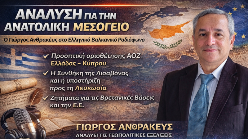 Για τις γεωπολιτικές εξελίξεις στη Μέση Ανατολή και τις προοπτικές που διαμορφώνονται για την Ελλάδα και την Κύπρο μίλησε ο διακεκριμένος νομικός Γιώργος Ανθρακέυς σε συνέντευξή του στον δημοσιογράφο Χρήστο Μουρτζούκο στο Ελληνικό Βαλκανικό Ραδιόφωνο.