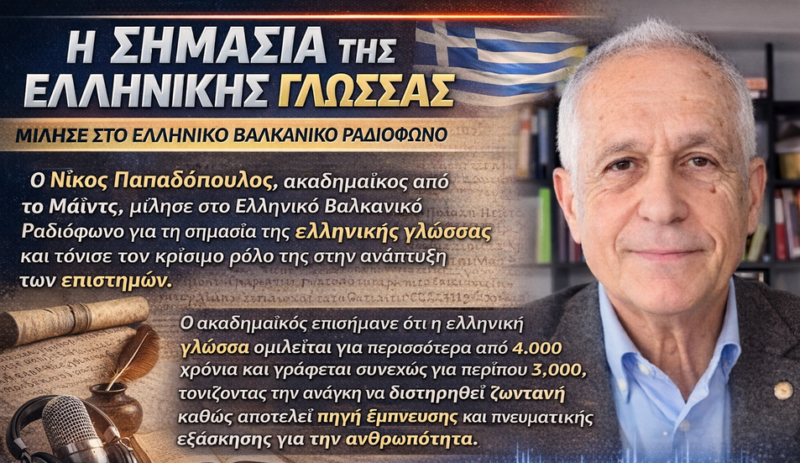 Τη διαχρονική σημασία της ελληνικής γλώσσας και τον καθοριστικό ρόλο που έχει διαδραματίσει στην εξέλιξη της ανθρωπότητας ανέλυσε ο ακαδημαϊκός από το Μάιντς, Νίκος Παπαδόπουλος, σε συνέντευξη που παραχώρησε στο Ελληνικό Βαλκανικό Ραδιόφωνο και στον δημοσιογράφο Χρήστο Μουρτζούκο.